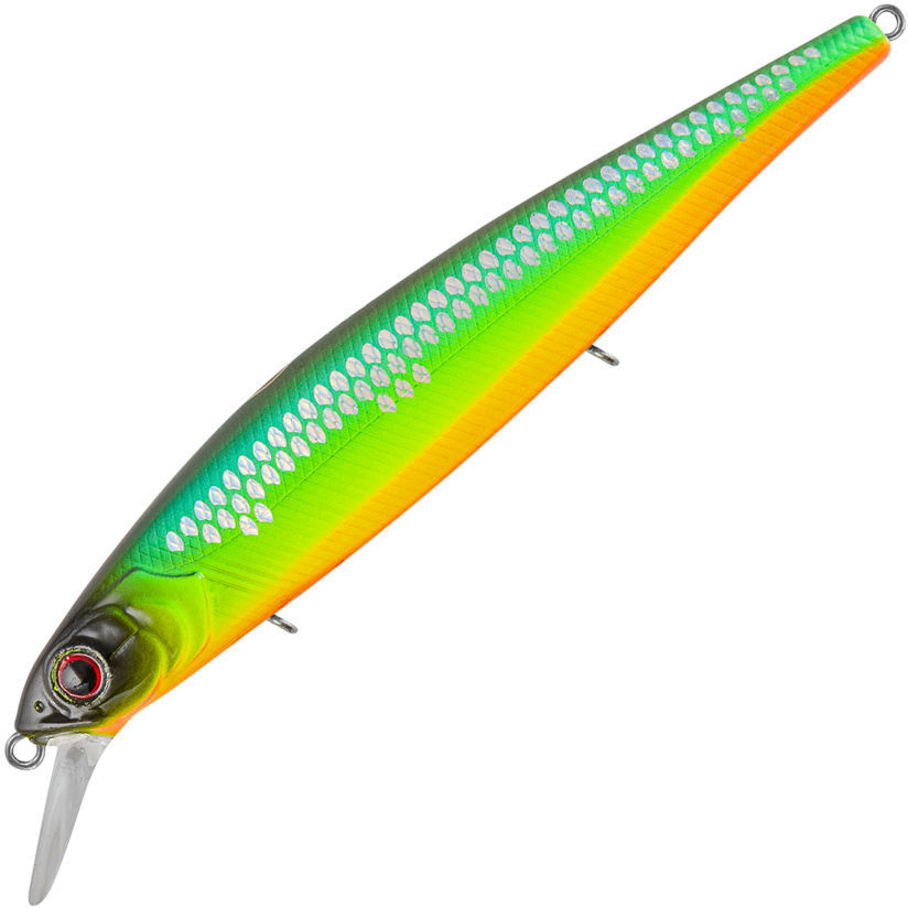 Среднеразмерный минноу (115 мм, 16,5 г) с нейтральной плавучестью — эффективная приманка для ловли хищника на глубинах 1,0–1,8 м.